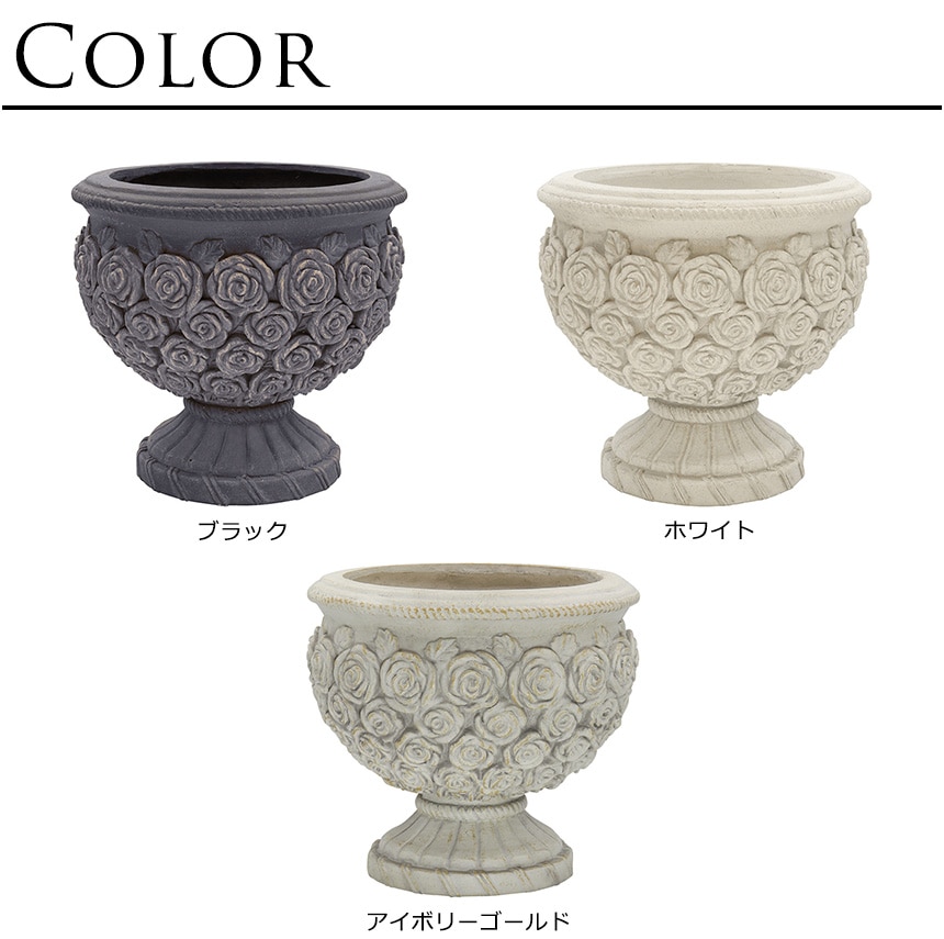 側面に花弁をたくさんあしらっした華美なプランター。 今まであるようでなかった、プランターが主役になれるとってもおしゃれなデザインです。 お花や造花をよりゴージャスに見せたいときにオススメ。 絢爛豪華な時代を誇ったローマ時代を想起させます。 コラム(柱を模した花台)と合わせて飾るとより一層魅力が引き立ちます。
