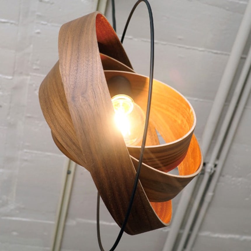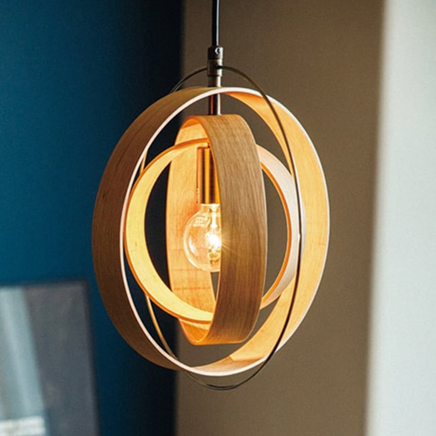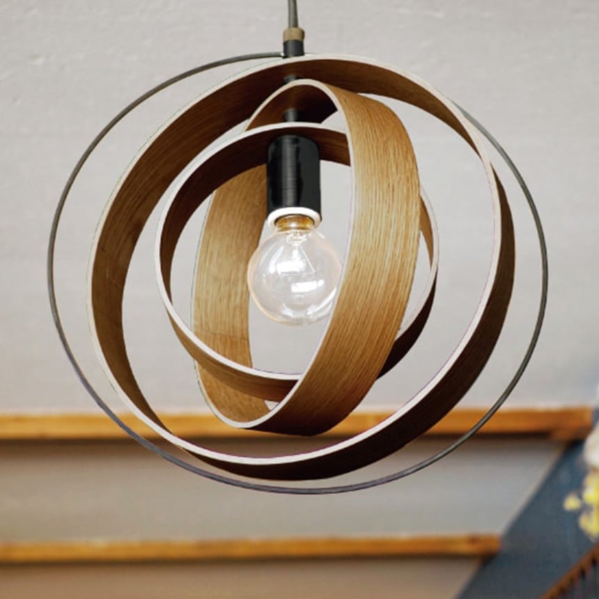 ウッドとスチールのリングを連ねた、他にはないユニークなデザインのペンダントライト。
