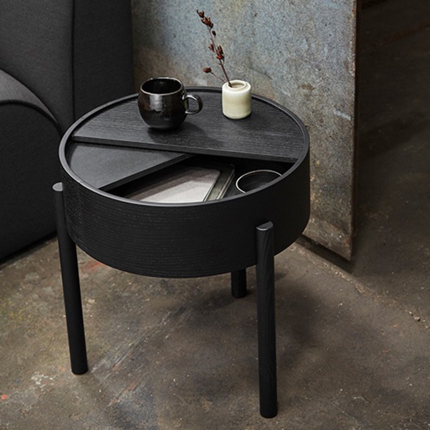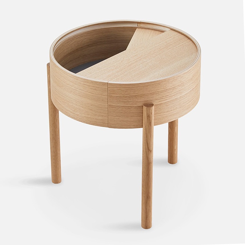 「アーク サイドテーブル」は、収納機能を備えた円形のデザインテーブル。