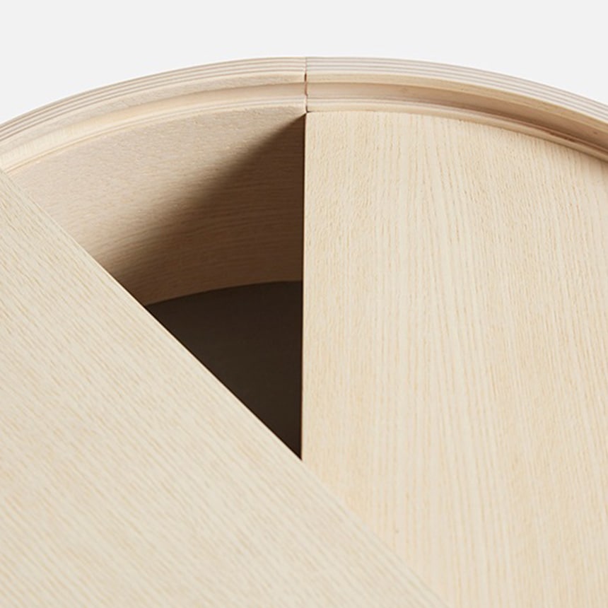 内側の収納スペースのミュートダークグレーの表面は木材を補完するために選択され、3本足の構造は幾何学的な形のデザインに遊び心と軽いタッチを加えます。