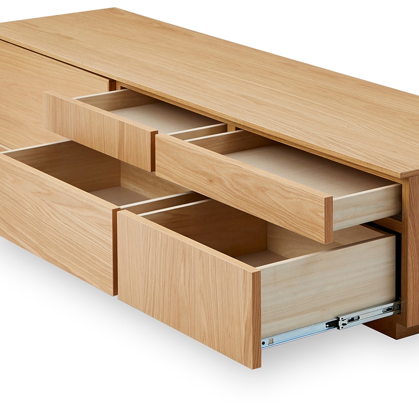 突板ガラス扉仕様のためリモコン通します 引き出しは4つの異なる形状にそれぞれ別方向に突板を貼っています |