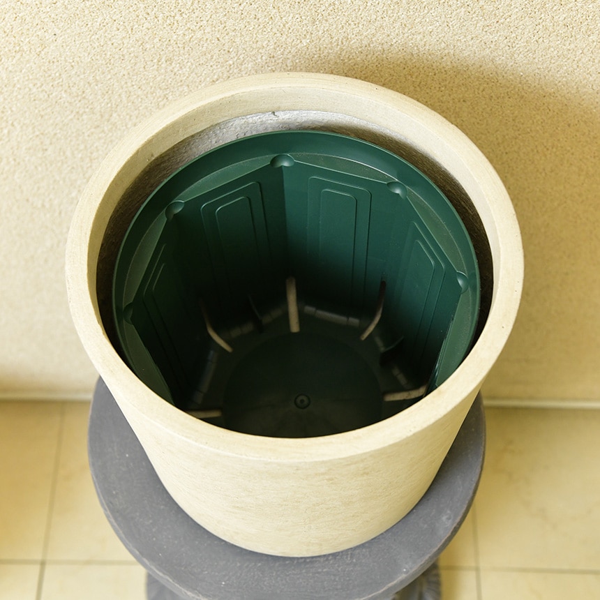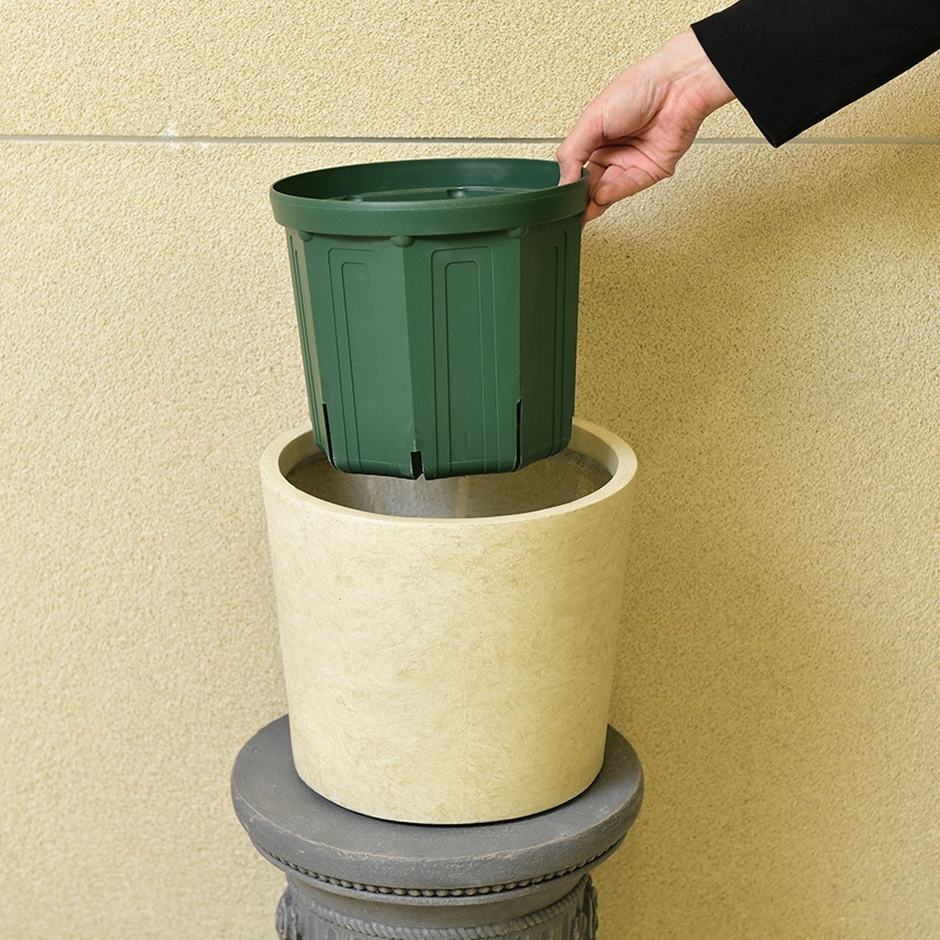 底穴がありますので、室内で鉢カバーとして使用する際には、内側に受け皿を設置してご使用ください。