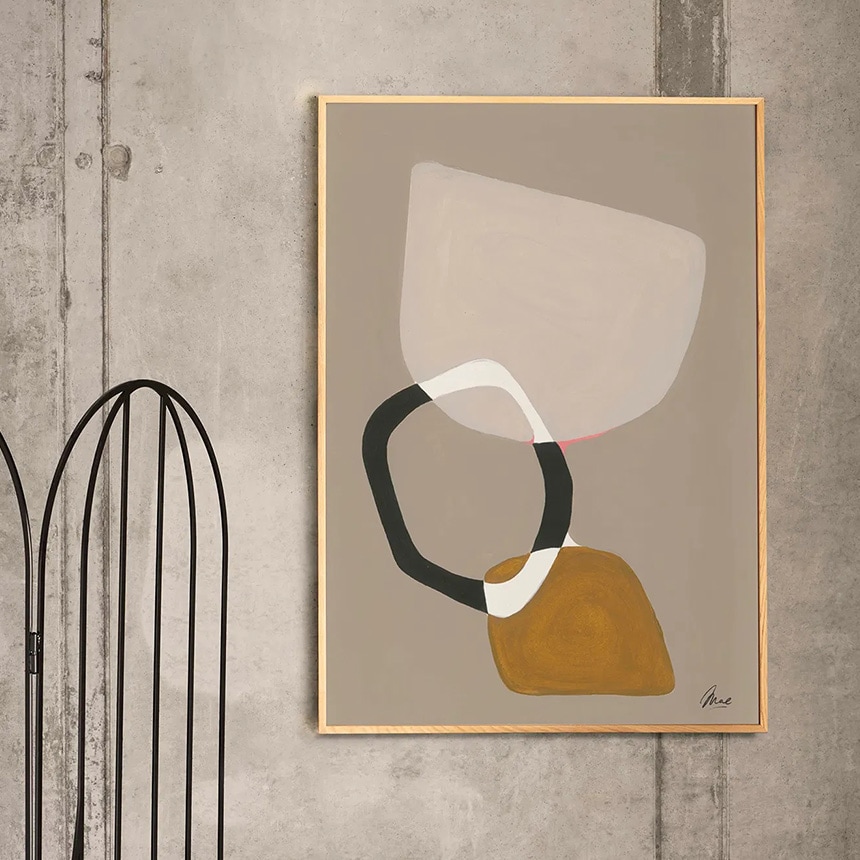 モノトーンの小石のようなフォルムが画面を横切り、力強いオークルと微かなピンクがアクセントとなり、癒しと大胆さが共存しています。