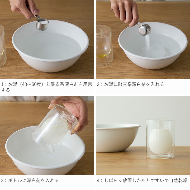 お湯(40〜50℃程度)に酸素系漂白剤を少し入れて漂白剤を作り、ボトルの中に漂白剤を入れてしばらく放置していただき、その後は水でよくすすいで洗い流し、自然乾燥させてください。