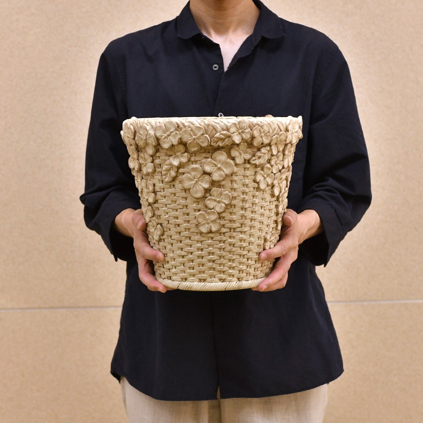手作りの編みカゴを基調に、側面にフラワーモチーフとした可憐で幻想的なプランターです。