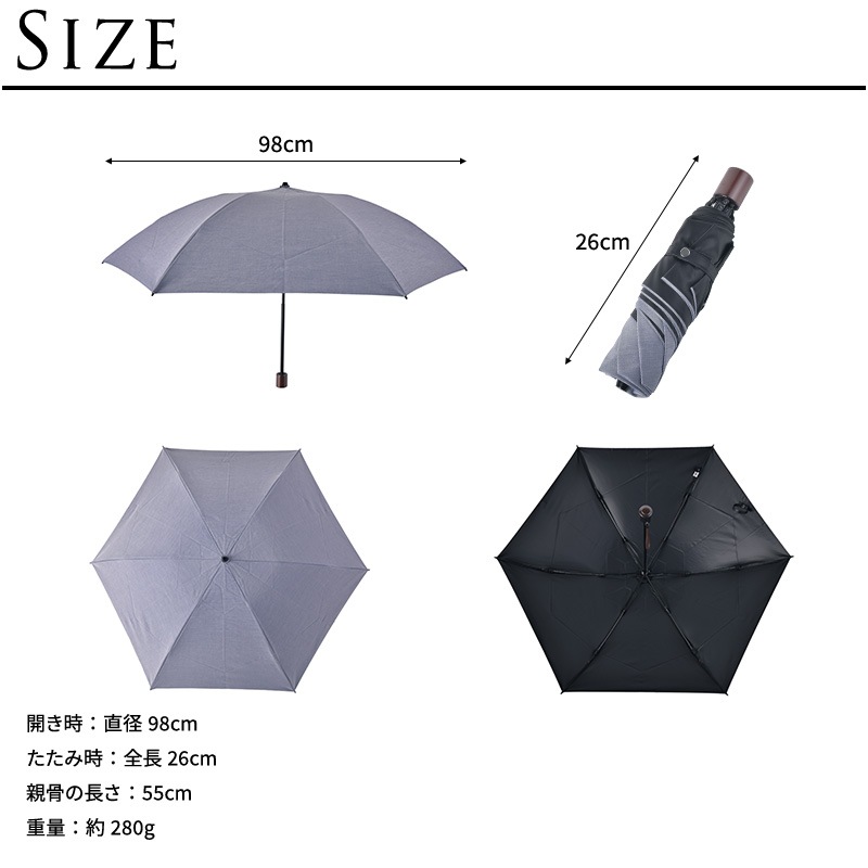 | 特徴 | ・遮光率99.99%以上と優秀なUVカット率を実現した「1級遮光」の晴雨兼用傘。日傘としても雨傘としてもお使いいただけるオールシーズン対応の折りたたみ傘です。