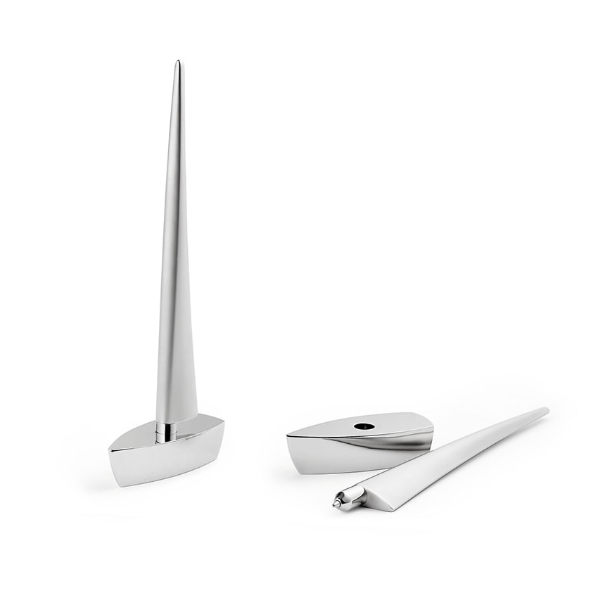 滑らかに磨き上げられた亜鉛ダイキャスト製の船型ベースが、ペンを優雅に支えるデスクアクセサリーです。